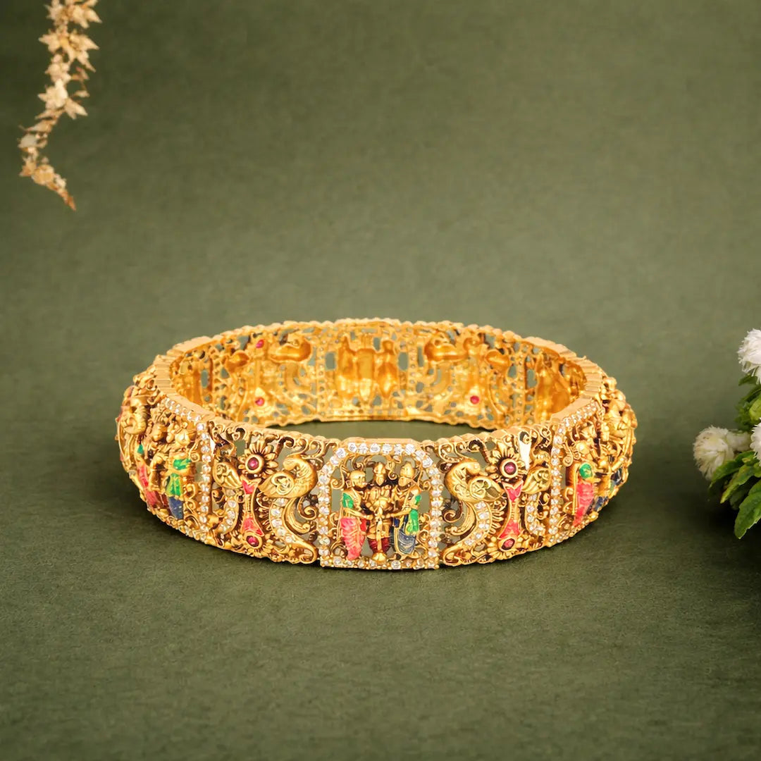 This collection draws inspiration from temple architecture, harvest symbolism, and traditional jewellery forms worn during Pongal. The use of gold plated silver antique jewellery online enhances the festive appeal while preserving intricate antique detailing.
