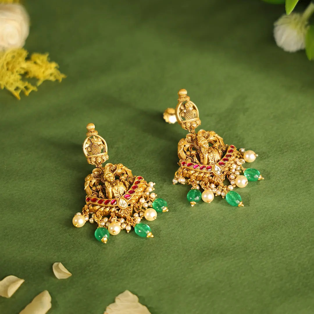 The gold plated silver antique earrings in this collection are crafted with detailed temple-inspired motifs that highlight the face beautifully. Lightweight and elegant, these earrings are ideal for women looking for festive jewellery that can be worn comfortably throughout Pongal celebrations.