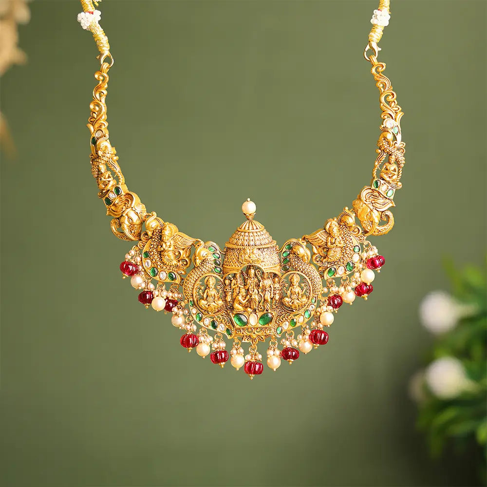 Our gold plated silver antique necklace designs feature classic South Indian craftsmanship with a festive golden finish. Perfect for pairing with silk sarees, these necklaces are a preferred choice for women searching for gold plated silver antique jewellery online for Pongal and traditional functions.